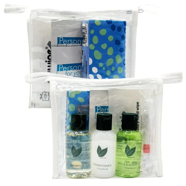 Each item is provided in travel-size or single-use format, ensuring practicality, hygiene and ease of distribution. The contents are packed in a clear, resealable bag, allowing staff to issue, store and replenish kits efficiently.