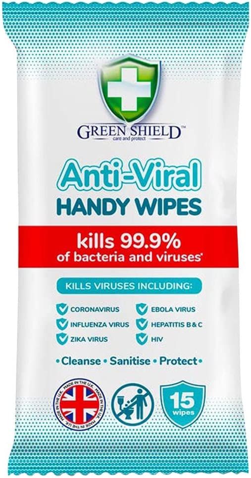 GreenShield Anti-Viral Handy Wipes 15's Kills 99.9% of Bacteria x 12 Green Shield Anti-Viral Handy Wipes - Pack of 15 .Practical, antibacterial cleaning wipes. Efforts to eliminate 99.9% of bacteria. Cleaning, disinfecting, protecting.