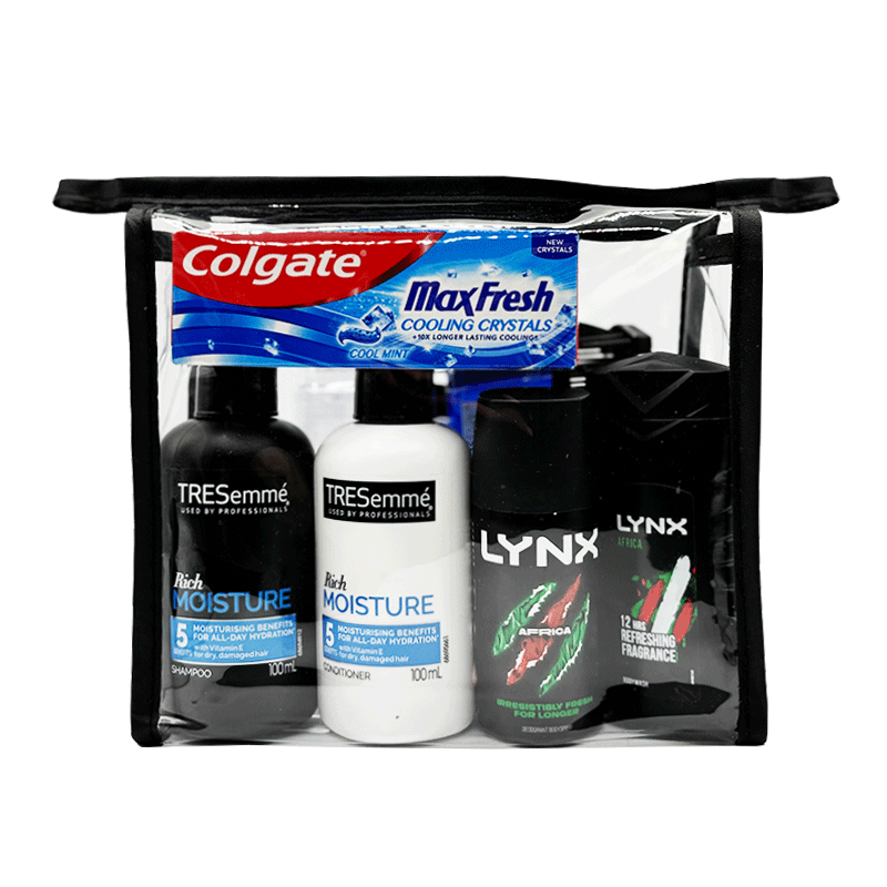 Lynx Men’s Wash Bag packed with trusted travel-size toiletries from Lynx, Tresemmé, VO5, and Colgate. Perfect for holidays, flights, or gym use. Airport-approved, branded, and discounted in bulk. A compact men’s wash bag with trusted branded toiletries, ideal for travel, gym bags and short trips, as well as hotels, guest accommodation, charities, councils and emergency housing.
