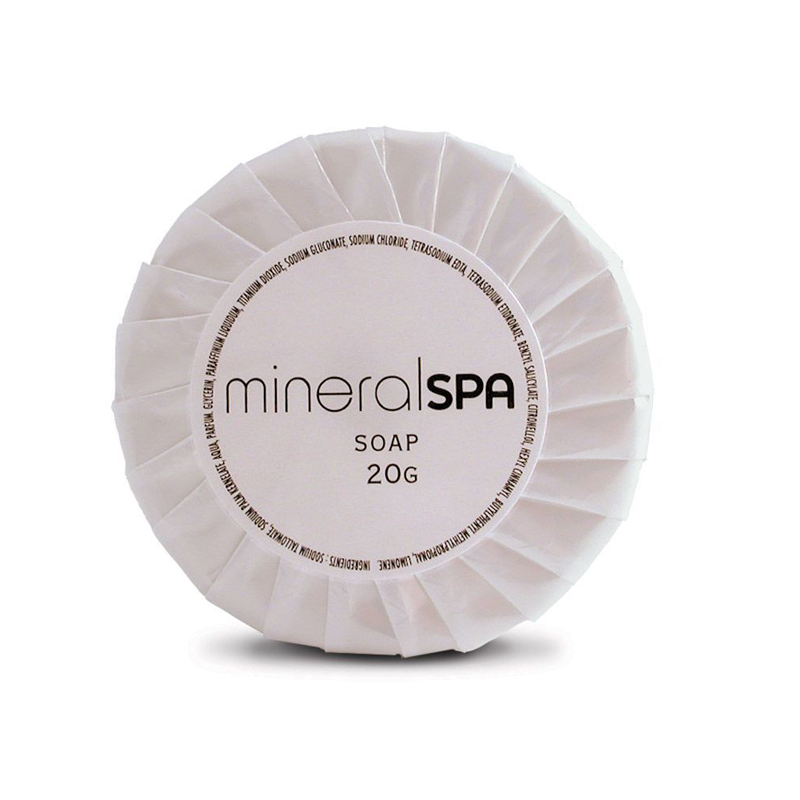 Mineral Spa Pleat Wrap Soap 20gm – Comes complete with the printed Mineral Spa logo and product description.
