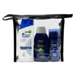 Nivea Men’s Toiletry Bag packed with branded travel-size toiletries from Nivea, Head & Shoulders, and Colgate. A waterproof clear wash bag ideal for holidays, gym, or business trips. Airport-approved, travel-ready, and discounted in bulk. A compact men’s toiletry bag with trusted branded essentials, ideal for holidays, short trips and travel, as well as hotels, guest accommodation, charities, councils and emergency housing.