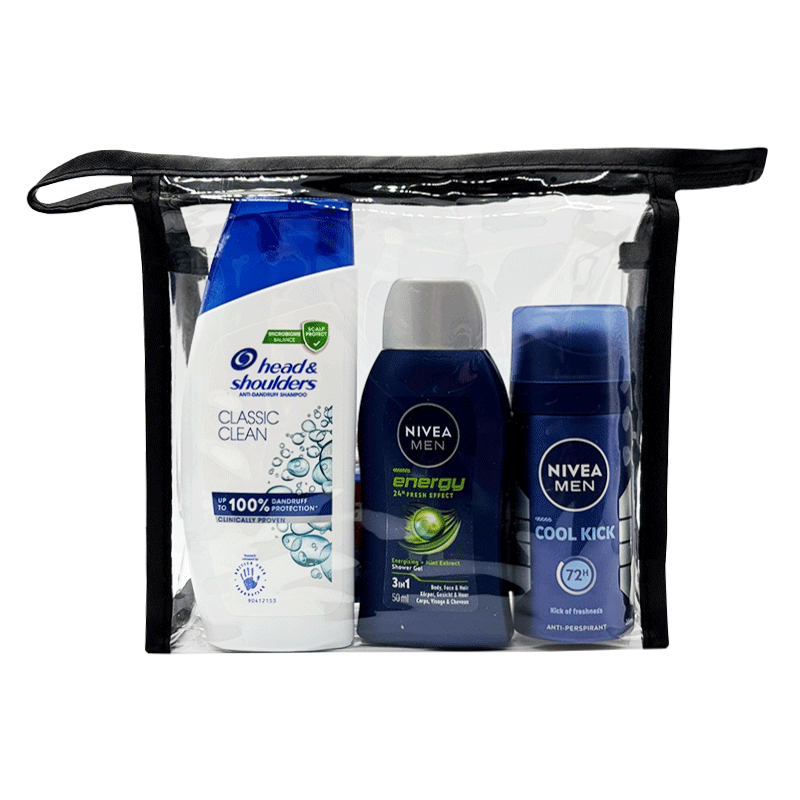 Nivea MenÕs Toiletry Bag with Head & Shoulders and Colgate minis. Waterproof and airport-approved clear wash bag for holidays. Buy online, discounted in bulk.