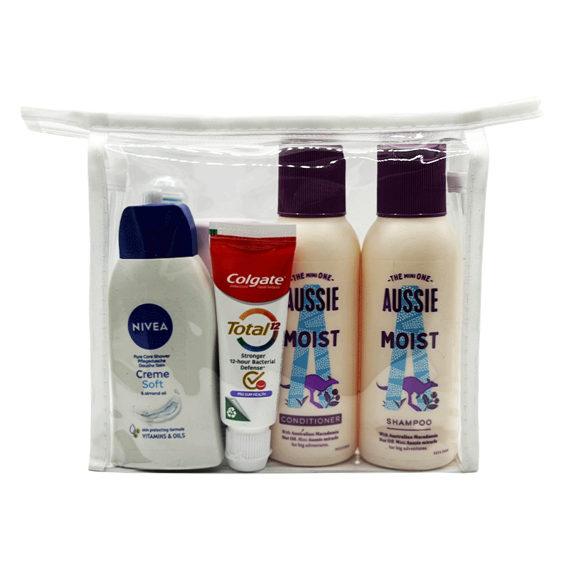 WomenÕs Toiletry Bag with Nivea Mini Set, Aussie Mini Shampoo, and Colgate minis. Airport-approved branded travel toiletries. Buy online, discounted in bulk.